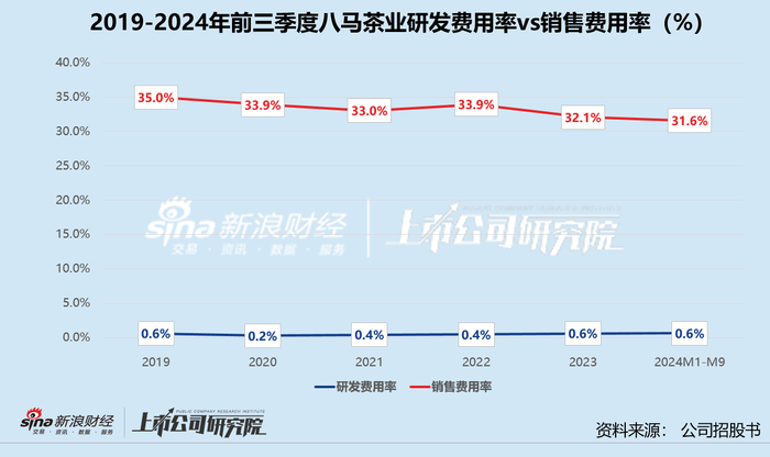 代工生产埋下品控风险,八马茶业的产品质量参差不齐。在黑猫投诉平台上,不少消费者反映高价购入的茶叶混入异物、不符合执行标准、过度包装等问题,回复率和处理率均低于40%。品质服务难撑起高溢价,技术投入也严重不足。2019-2024年前九个月,公司的研发费用率长期低于1%,2023年才刚刚突破千万元级别。