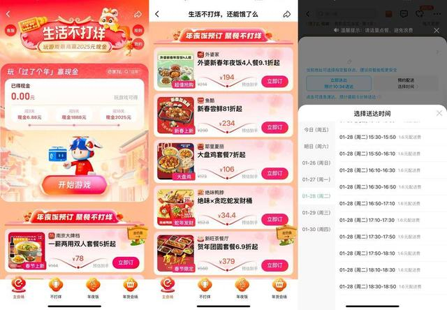 为了丰富过节氛围,1月24日起,饿了么APP内还上线有“过了个年”闯关游戏。搜索“过年”,消费者可进行游戏闯关,闯关后可随机获得包含超级吃货卡、爆红包、现金额度权益等诸多类型权益,还有机会获得最高2025元的现金额度权益。