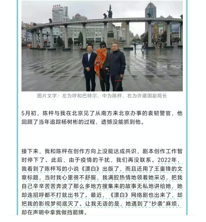 然而,22日中午,陈枰声明中提到的“电影制片人”呼和巴特尔在网络现身,发布了一篇名为《职业影视制片人曝网络剧〈漂白〉猛料》的文章。他指责,在与陈枰合作期间,自己曾满腔热情地带她去哈尔滨采访,并推荐了王猛的《漂白》报道,还无私地分享了自己四处奔波收集来的故事。但因为两人未能就剧本方向达成共识,剧本创作暂停后,陈枰竟“连招呼都不打就出书了”,还将自己当作“抄袭”风波中的挡箭牌,这让他感到十分寒心。