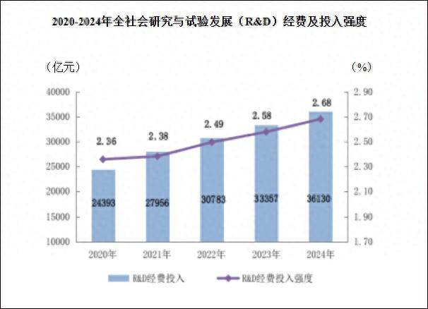 数据显示,2021年,中国研发投入较上年大幅增长14.6%,但受疫情影响,后续两年增幅分别降至10.1%和8.4%。不过,中国研发投入强度保持相当稳定的增长,从2020年的2.36%,上升到2021年的2.38%,再到2022年的2.49%以及2023年的2.58%。2024年,这一指标继续上升至2.68%。