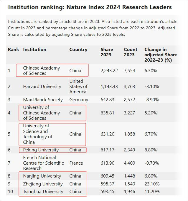 《自然》指数2024年研究领导者排名,排名前10位的研究机构中有7家在中国 自然指数