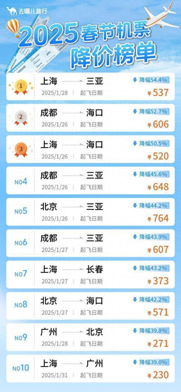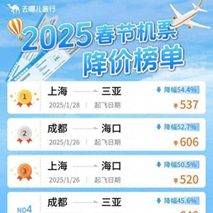 去哪儿盘点了近期国内热门机票降价榜,1月26日-29日各地前往海口、三亚的机票价格降幅最高,如1月28日上海-三亚,同比近30天均价降价幅度近55%,降价金额超500元;1月26日成都-海口降价53%,最低606元起;北京-三亚,降价44%,最低764元起……