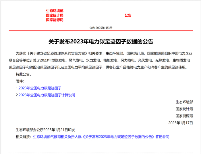 近日,生态环境部联合国家统计局、国家能源局印发了《关于发布2023年电力碳足迹因子数据的公告》(以下简称《公告》)。生态环境部应对气候变化司负责同志就《公告》相关情况回答了记者提问。