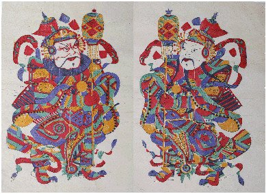 四是贴门神,“造桃板着户,谓之仙木。绘二神,贴户左右,左神荼,右郁垒,俗谓之门神”,在两块桃板上绘制神荼、郁垒二神像,贴于门上,一左一右,“门神”的称呼,此时已经形成。
