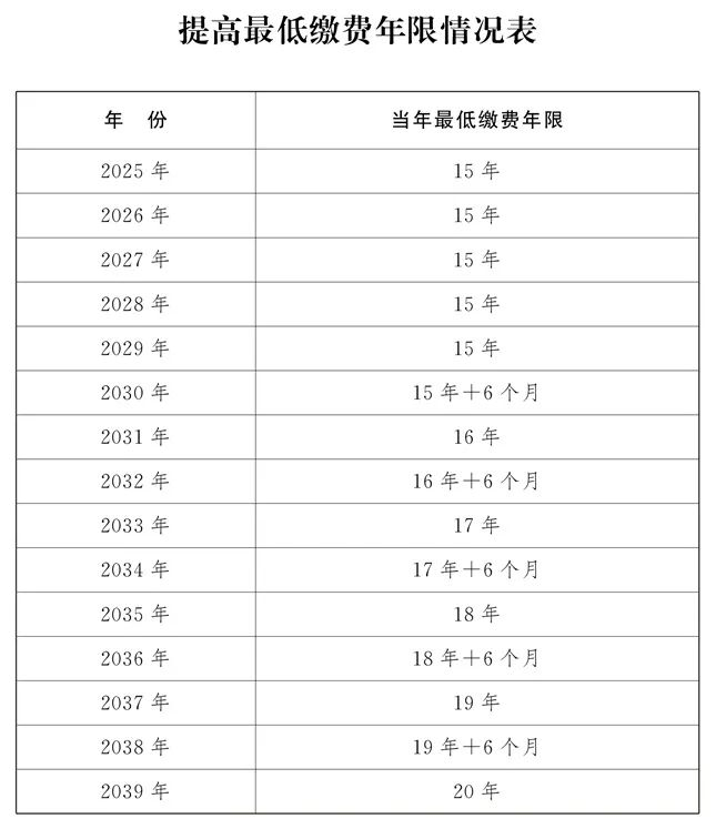 需要注意的是2029年12月31日前,职工按月领取养老金的最低缴费年限仍是15年。从2030年1月1日起,按照每年提高6个月的节奏,将职工按月领取基本养老金最低缴费年限由15年逐步提高至20年。详情可查看下表: