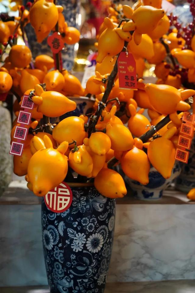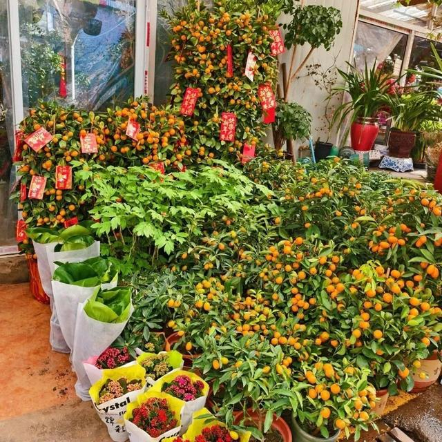 金桔盆栽也卖得火热,金灿灿的小桔子挂满枝头,寓意着“金玉满堂”,每一盆上面挂着福袋装饰,看起来格外喜人。