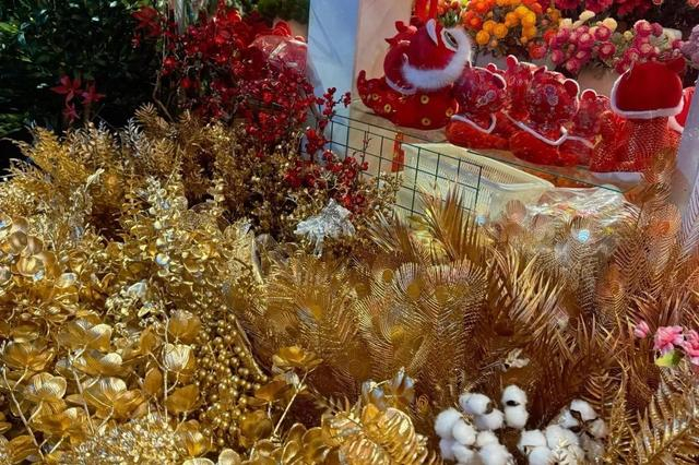 红灯笼、可爱的玩偶、福字、对联、财神等节庆装饰品陈列在店铺门口,一眼望去,热闹喜庆的氛围扑面而来,令人目不暇接。