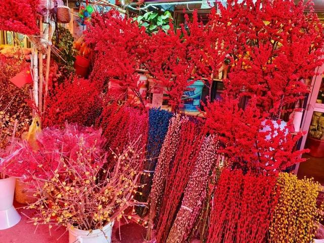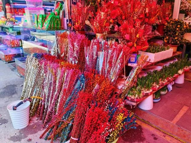 红色、粉色、黄色、蓝色、白色的银柳整齐摆放在花店门口,修长的枝干错落有致,枝头花芽饱满,或热烈火红,或温柔粉嫩,仿若轻声诉说“家有银柳,越过越有”的美好期许。部分商铺门口还有精心搭配的银柳福气桶,颜色鲜艳夺目,造型美观,再挂上福袋、红灯笼等装饰,营造出浓郁的年味。