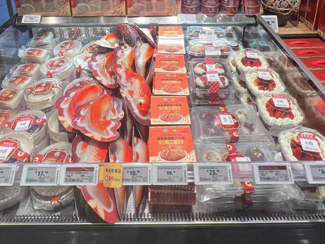 八宝饭、糯米团子等传统甜点也整齐地摆放在货架上,散发着诱人的香气,仿佛在召唤着人们将它们带回家,增添过年的甜蜜滋味。