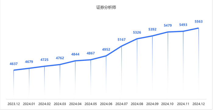 证券分析师数量在2024年底为5563人,较2023年底的4637人增加了926人,增幅约20%。从月度变化来看,分析师人数呈稳定增长态势,2024年下半年增长提速。