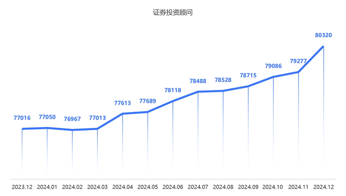 证券投资顾问人数从2023年底的77016人增长至2024年底的80320人,增加了3304人,增幅约4.29%。从月度变化趋势来看,增速也在逐渐上升,尤其是2024年第四季度,证券投资顾问显著增长。