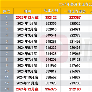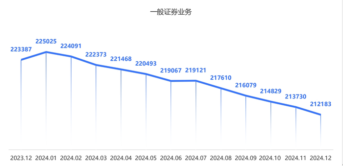 一般证券业务人员在2023年底为223387人,至2024年底降至212183人,减少了11204人,降幅约5.02%。从全年变化情况来看,从年初至年底,整体均呈下降趋势,其中4-5月、7-8月、10-12月的下降幅度较为明显,分别减少了1000-1500人左右。