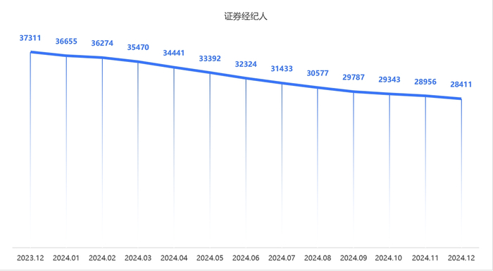 证券经纪人数量从2023年底的37311人锐减至2024年底的28411人,减少了8900人,降幅高达23.85%。1月尚有36655人,到2月减少至36274人,减员381人;此后下滑速度加快,6月降至32324人,较年初减少4331人;至12月,仅余28411人。