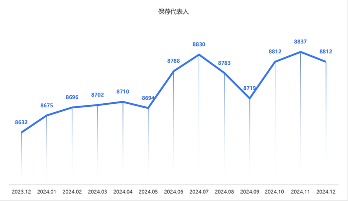 保荐代表人队伍在2024年底达到8812人,相比2023年底的8632人增加了180人,增幅约2.09%。年初为8632人,此后月份有增有减,虽有月度波动,但整体保荐代表人数较为稳定,且呈上升趋势。