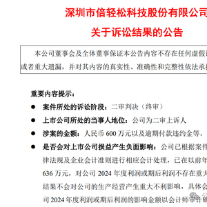 1月23日,深圳市倍轻松科技股份有限公司(以下简称“倍轻松”)发布了关于诉讼结果的公告。倍轻松二审败诉维持原判,因此公司需支付人民币600万元广告费以及逾期付款违约金等。