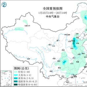 预计25日白天,华北中南部等地有轻度霾,局地中度霾。25日夜间起,受降雪和冷空气影响,华北中南部的霾天气逐渐消散。另外,25日新疆东部和南疆盆地、内蒙古西部、青海北部、甘肃北部、宁夏北部等地有扬沙和浮尘天气,局地有沙尘暴。