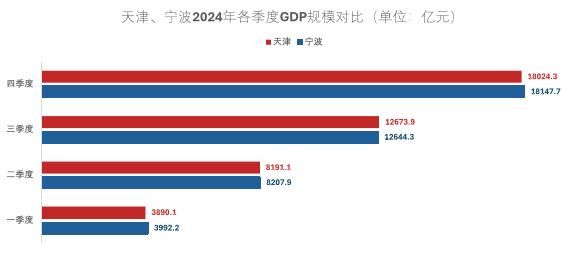 过去五年间,天津和宁波两座城市的差距整体呈现缩小趋势。从2020年的1400亿元,到2022年的400亿元。2023年,二者差距曾经一度拉大到700亿元。不过2024年以来,宁波在第一、二季度的GDP表现始终优于天津,第三季度天津奋力反超,但最终宁波还是在四季度成功实现了历史性突破,超过天津100多亿元。