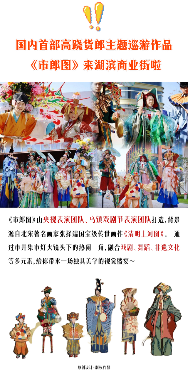 另外,国内首部高跷货郎主题巡游作品——《市郎图》将来到湖滨商业街,该作品由央视表演团队、乌镇戏剧节表演团队打造,以著名的《清明上河图》为故事背景,融合戏剧、舞蹈、非遗等元素,给市民游客带来一场独具美学的视觉盛宴。