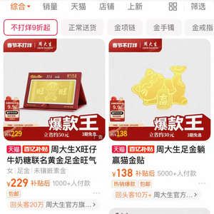 记者搜索周大生天猫旗舰店,发现近期几款爆款产品都是这类定价在100多元黄金手机贴或者挂件,这些黄金贴纸的重量大多在0.1g左右,配合透明的外壳。如一款近期销售火爆的黄金手机贴,品牌方推出了多款与周同学、旺旺、招财猫等IP联名的款式,售价99-139元,记者看到24小时内已有100人下单,目前下单超过7000人。