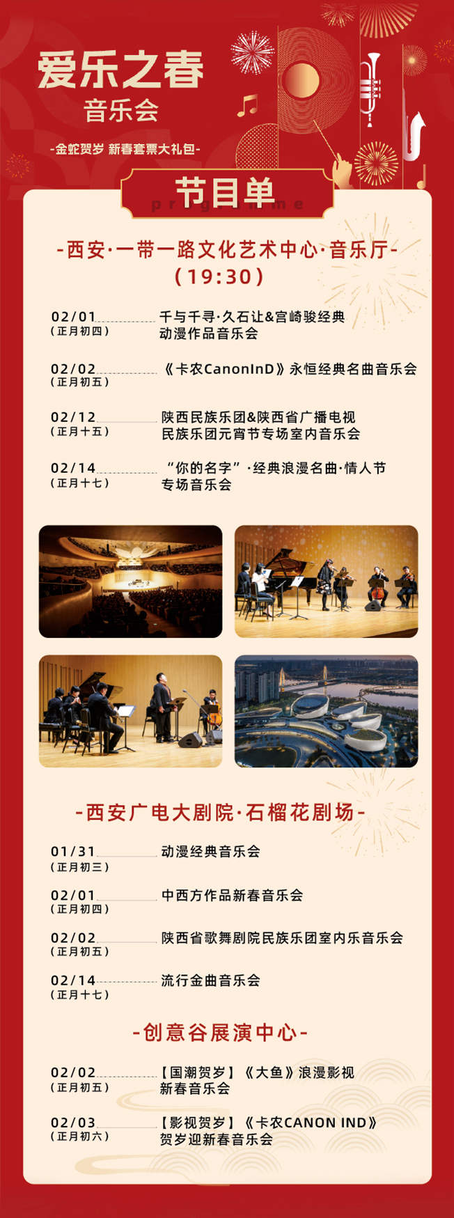 音乐会方面,西安·一带一路文化艺术中心·音乐厅、西安广电大剧院·石榴花剧场、创意谷展演中心将迎来陕西省广播电视民族乐团、陕西民族乐团、陕西省歌舞剧院民族乐团与烟花室内乐团几位老朋友,呈现国乐精粹与经典金曲两大主题。