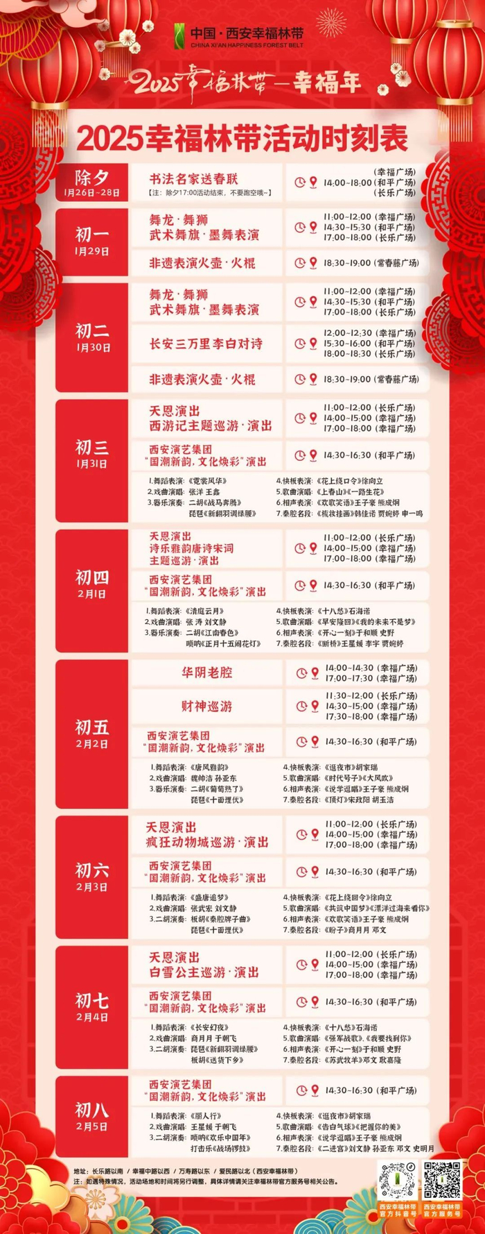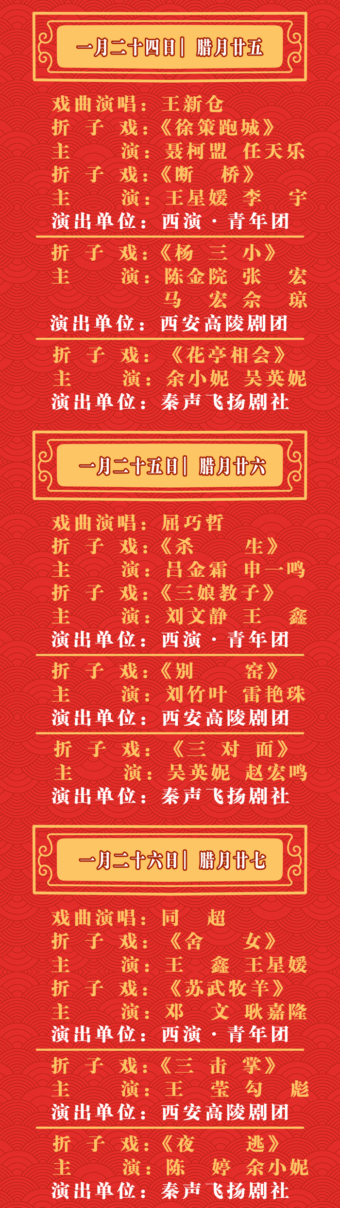 此外,西演集团旗下西演・青年团、西安歌舞剧院、西安市说唱艺术团等,从正月初三至正月初八将在西安市幸福林带和平广场共同开启“幸福林带幸福年”综艺演出活动,让秦腔与多样艺术种类同台乐动,和市民共度春节。