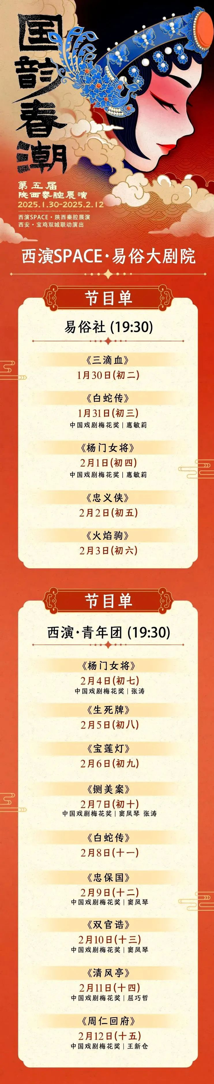 2025年乙巳蛇年春节期间,西演剧院运营管理公司(西演SPACE)联合百年易俗社、百年三意社、西演·青年团三大秦腔名团,为大家带来第五届“国韵春潮”陕西秦腔展演。