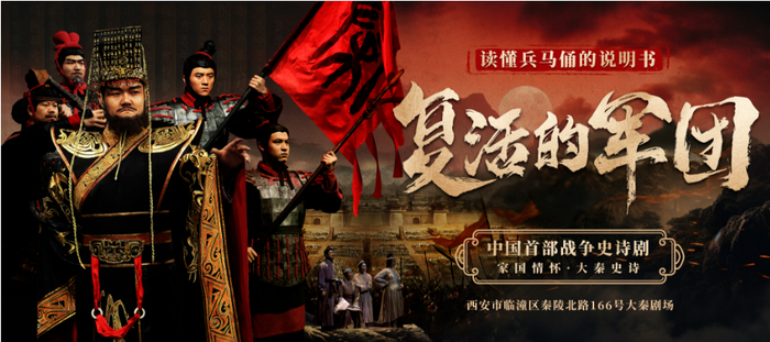 在临潼区秦陵北路大秦剧场演出的《复活的军团》沉浸式多媒体战争史诗剧,被称为“读懂兵马俑的说明书”。该剧由导演金铁木执导,共四幕十场。