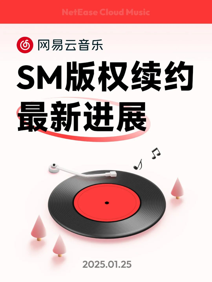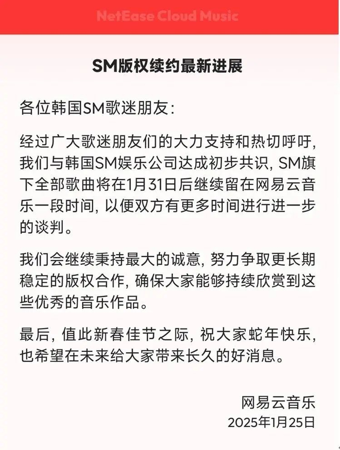 1月25日,网易云音乐发布《SM版权续约最新进展》公告,显示其与SM娱乐版权续约谈判出现转机,版权到期后暂时无需下架。
