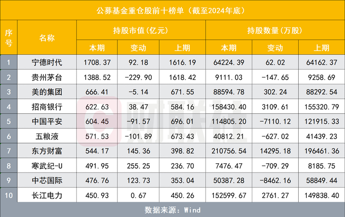 公募第一大重仓股揭晓,“宁王”登顶,东方财富、寒武纪、中芯国际、长江电力新晋前十
