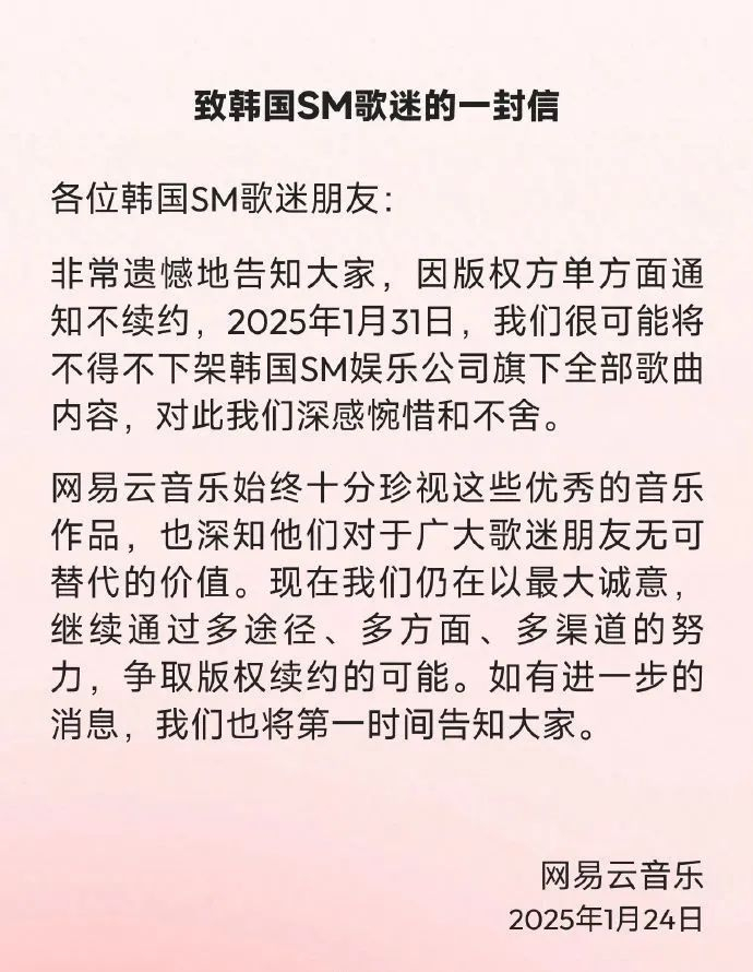 网易云音乐官方1月24日发布《致韩国 SM 歌迷的一封信》,表示因版权方单方面通知不续约,很可能将下架韩国 SM 娱乐公司旗下全部歌曲内容: