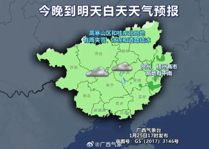 今晚(25日晚)到明天(26日白天),全区阴天大部有小雨,其中贺州、梧州两市局地有中雨。高寒山区和桂东北局地有雨夹雪、冰冻和道路结冰。最低气温:高寒山区-3℃~2℃,桂北2℃~6℃,桂南7℃~12℃。