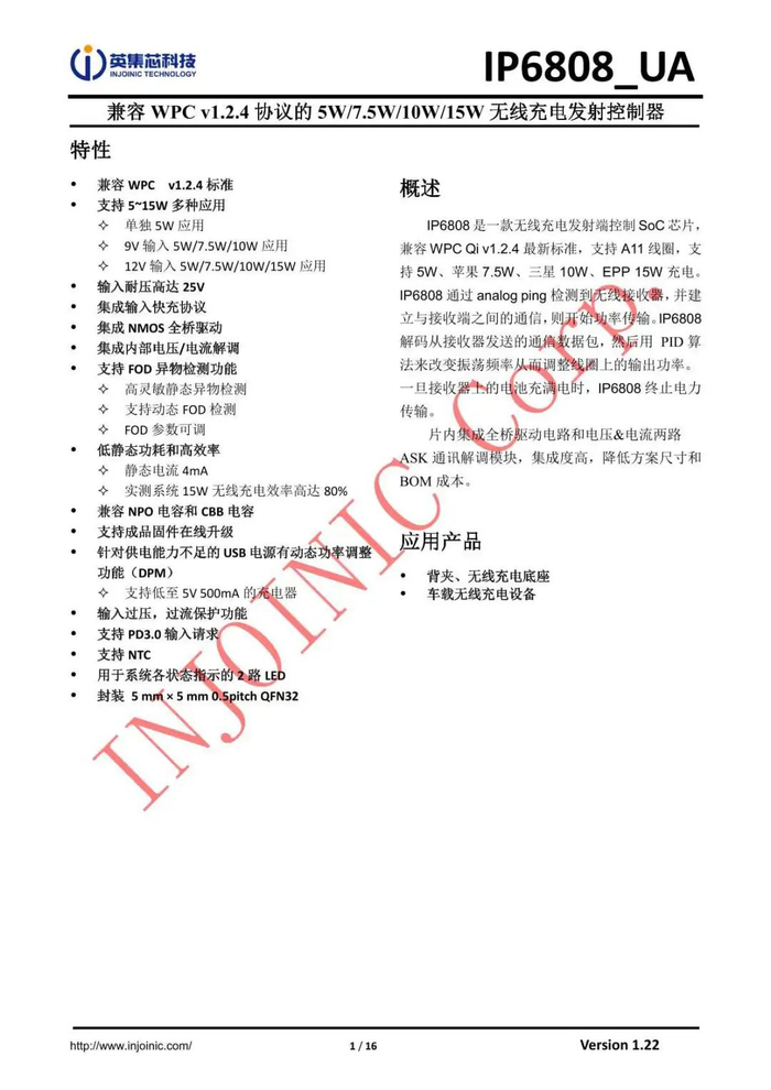 英集芯IP6808是一款无线充电发射端SoC控制芯片,兼容WPC Qi v1.2.4最新标准,支持A11线圈,支持5W、苹果7.5W、三星10W充电。