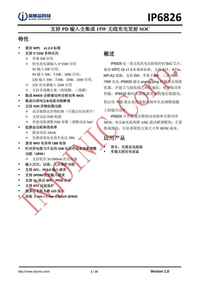 IP6826 是一款无线充电发射端控制 SoC 芯片,兼容 WPC Qi v1.2.4 最新标准,支持 A11、A11a、MP-A2 线圈,支持 5W、苹果 7.5W、三星 10W、15W 充电。IP6826 通过 analog ping 检测到无线接收器,并建立与接收端之间的通信,则开始功率传输。
