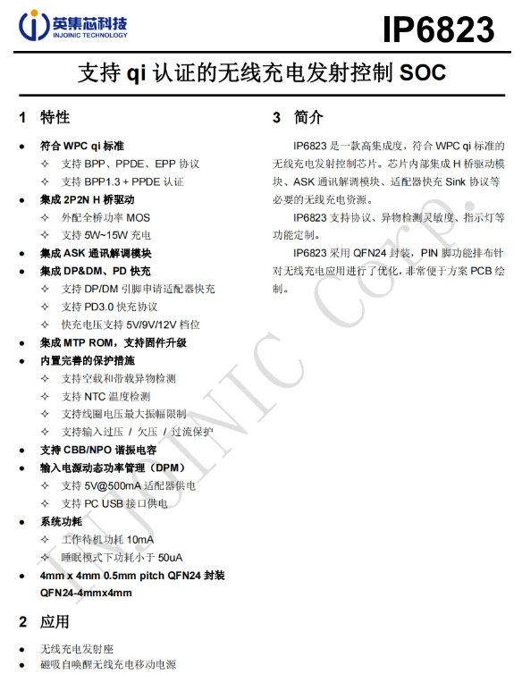 IP6823 是一款高集成度,符合 WPC qi 标准的无线充电发射控制芯片。芯片内部集成 H 桥驱动模块、ASK 通讯解调模块、适配器快充 Sink 协议等必要的无线充电资源。IP6823 支持协议、异物检测灵敏度、指示灯等功能定制。IP6823 采用 QFN24 封装,PIN 脚功能排布针对无线充电应用进行了优化,非常便于方案 PCB 绘制。