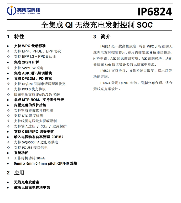 IP6824 是一款高集成度,符合 WPC qi 标准的无线充电发射控制芯片。芯片内部集成 H 桥驱动模块、H 桥电路、ASK 通讯解调模块、FSK 调制模块、适配器快充 Sink 协议等必要的无线充电资源。IP6824 支持协议、异物检测灵敏度、指示灯等功能定制。IP6824 采用 QFN40 封装,引脚分布合理,适合无线充方案设计。
