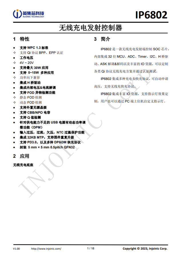 IP6829 是一款无线充电发射端控制 SoC 芯片,兼容 WPC Qi v1.3 最新标准,支持 A11、A11a、MP-A2 线圈,支持 5W、苹果 7.5W、三星 10W、15W 充电。IP6829 通过 analog ping 检测到无线接收器,并建立与接收端之间的通信,则开始功率传输。