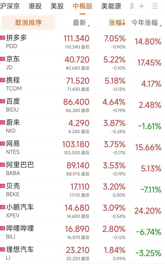 热门中概股多数走强,金山云涨13.1%,爱奇艺涨11.5%,拼多多涨7.05%,好未来涨5.6%,京东涨5.22%,携程涨5.18%,腾讯音乐涨4.89%,百度涨4.64%,蔚来涨3.87%,阿里巴巴涨3.53%,小鹏汽车涨3.09%,理想汽车涨1.84%。