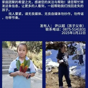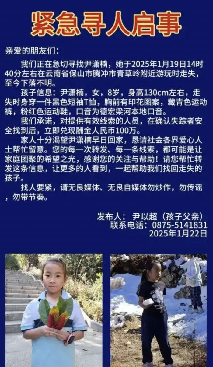 据家属发布的寻人启事显示,尹潇楠,女,8岁,身高130cm左右,走失时身穿黑色短袖T恤(胸前有印花图案)、藏青色运动裤及粉红色运动鞋,口音为德宏梁河本地口音。家属承诺,在确认失联者安全找到后,对提供有效线索的人员立即兑现酬金人民币100万元。