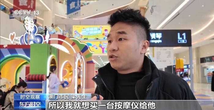 澳门市民 梁先生:爸爸去年说,腰有点紧绷,所以我想买一台按摩仪给他,放松放松肌肉,希望他明年身体健康。我妈妈喜欢到处旅游、拍照,刚好她手机坏了,就买了新的手机给她,拍多一点美美的照片,也希望她明年开开心心。