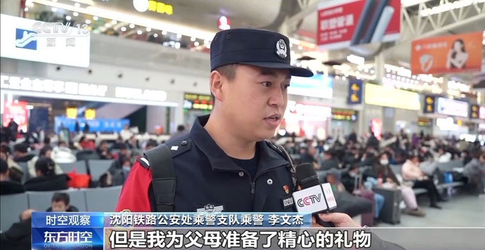 沈阳铁路公安处乘警支队乘警 李文杰:每年春运都是铁路乘警工作最忙的时候,虽然不能跟父母一起过年,但是我为父母准备了精心的礼物,给他们买了最新的智能手机。我们可以通过智能手机视频,包括说我在车上的时候,可以看到让他们感受到列车上的春运是什么样的,感受到列车上的年味。