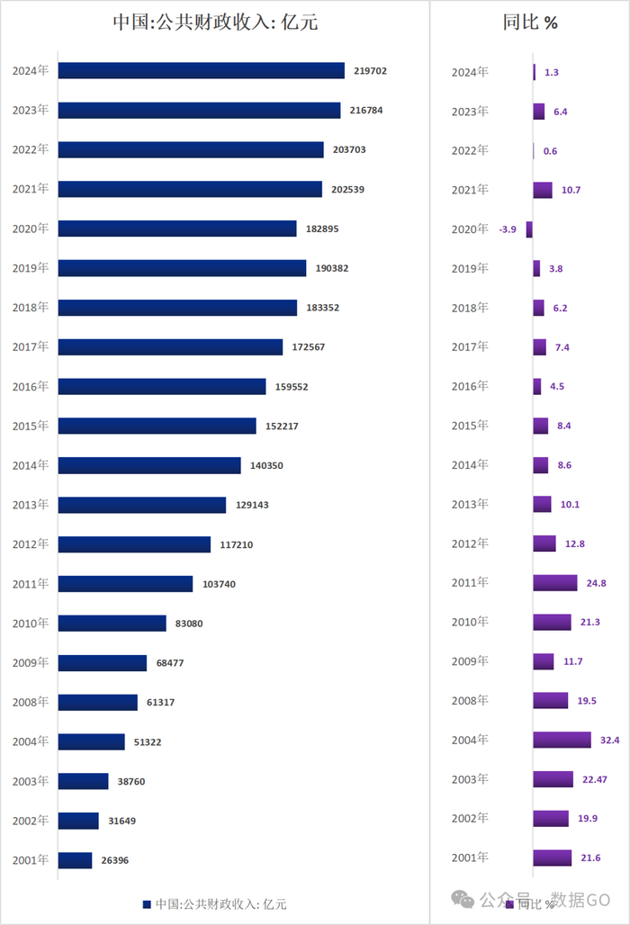 2024年,中国财政收入21.97万亿元,创历史新高,同比增长1.3%。