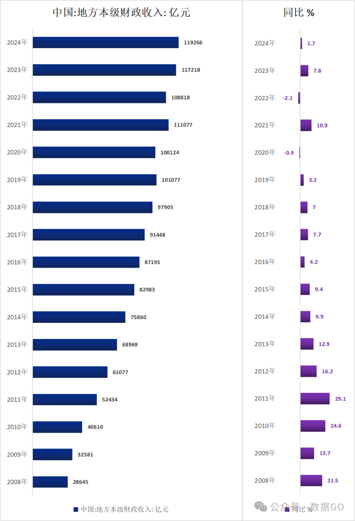 2024年,中国地方本级财政收入11.93万亿元,同比增长1.7%。