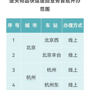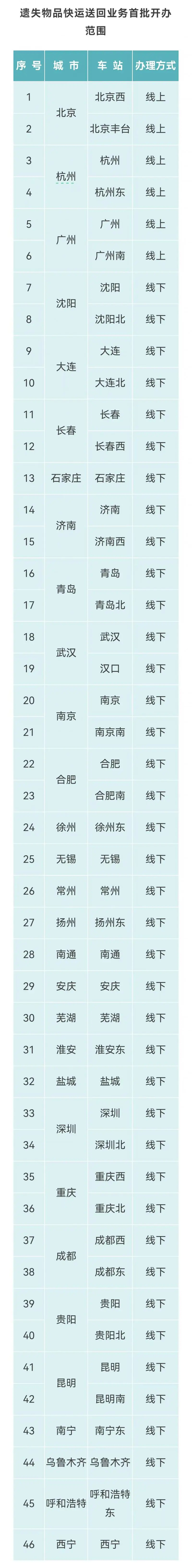 1月25日起,铁路部门在北京西站、北京丰台站、杭州站、杭州东站、广州站、广州南站等3座城市6个车站试点开展遗失物品线上预约快运送回服务,进一步提升便民服务水平。