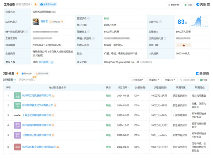 天眼查显示,无忧传媒最早的公司实体是湖南无忧娱乐有限公司,成立于2016年,位于湖南省长沙市,是一家互联网型经纪公司,以从事娱乐业为主的企业。公司注册资本1000万元,对外投资了14家企业。2020年起,其法定代表人雷彬艺又前后注册了无忧传媒集团有限公司、杭州无忧传媒有限公司等。