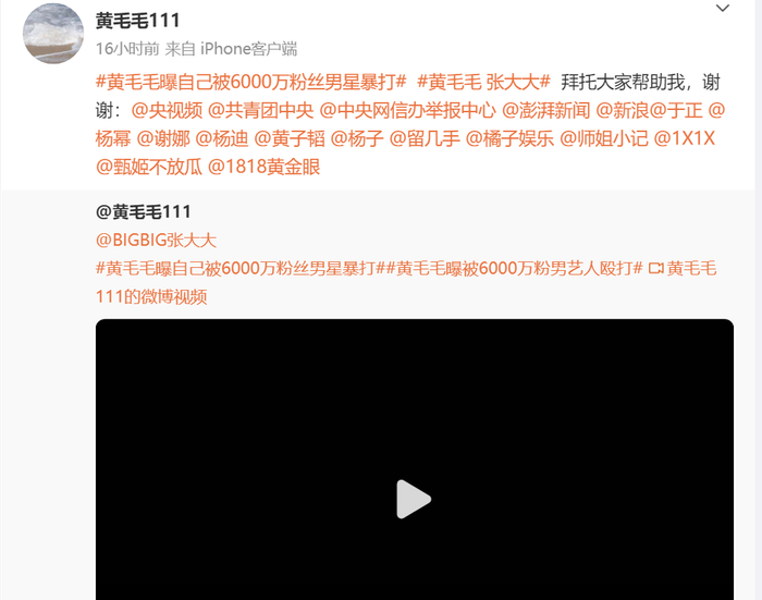 25日,黄毛毛再次发声,还@不少明星求助。