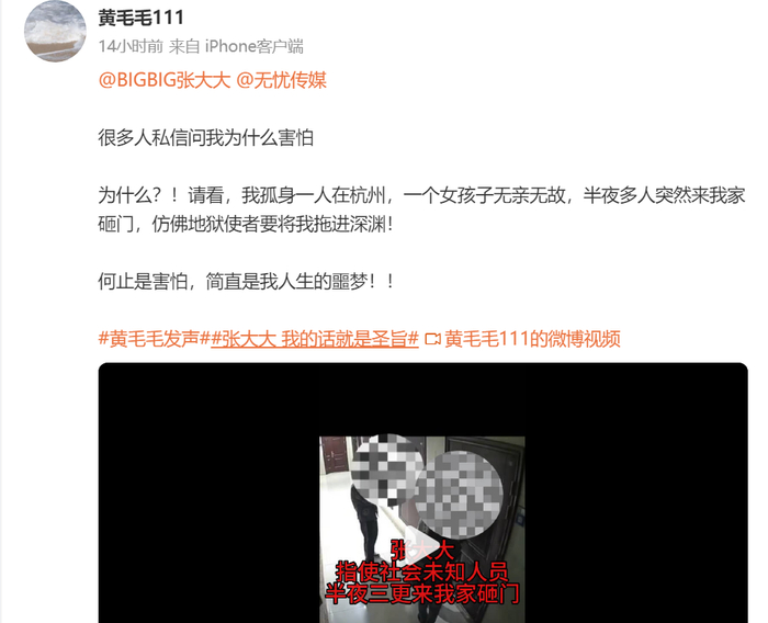 据黄毛毛称,2024年10月27日,因为脚本沟通问题,张大大不满意,对自己进行了长达两小时的“非人伤害”,用枕砸、掀起茶几砸、用玻璃杯砸。