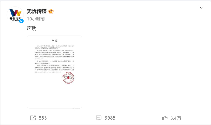1月26日凌晨, 无忧传媒发布声明表示,鉴于此事调查仍在进行当中,经公司慎重考虑,无忧传媒暂停与张某的一切业务开展,并将持续彻查此事。
