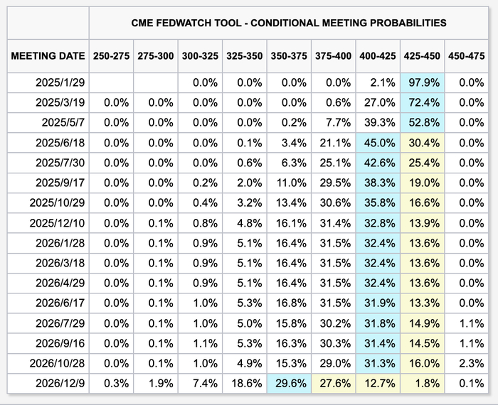 目前市场普遍预期,美联储1月将按兵不动将政策利率维持在4.25%-2.50%的水平。芝商所(CME )美联储观察工具数据显示,市场预计美联储1月维持当前利率不变的可能性为99.5%,降息25个基点的概率仅为0.5%,2025年全年美联储降息幅度为1-2次。