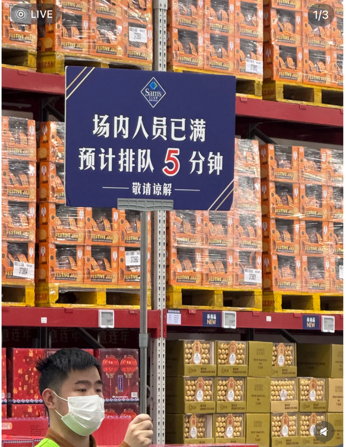 多地山姆会员店场内亮出了排队时间提示牌。