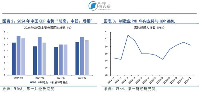 2024年,我国经济基本面呈现出“前高、中低、后扬”的特征。国家统计局最新公布的GDP数据显示,2024年四个季度我国不变价GDP同比增速分别为5.3%、4.7%、4.6%和5.4%,其中第一季度和第四季度的GDP增速较高,而第二、第三季度的GDP增速相对较低。反映经济景气程度的制造业PMI数据也传递出了类似的信息,2024年3月中国制造业PMI达到年内高点50.8,而在5月至9月期间,中国制造业PMI连续5个月处于荣枯线以下,10月之后PMI指数再度回升至荣枯线以上。